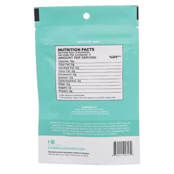 Ingredients: Pectin, Sugar, Citric Acid, Water, Tapioca Syrup, Natural Flavoring, Natural Coloring, Full Spectrum Hemp Extract