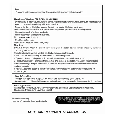 Ingredients: Cannabidiol, Methacrylic Acid, Ethylhexylacrylate, Bentonite, Sodium Stearate, Melatonin, Chamomile, Magnesium, Lavender extract.