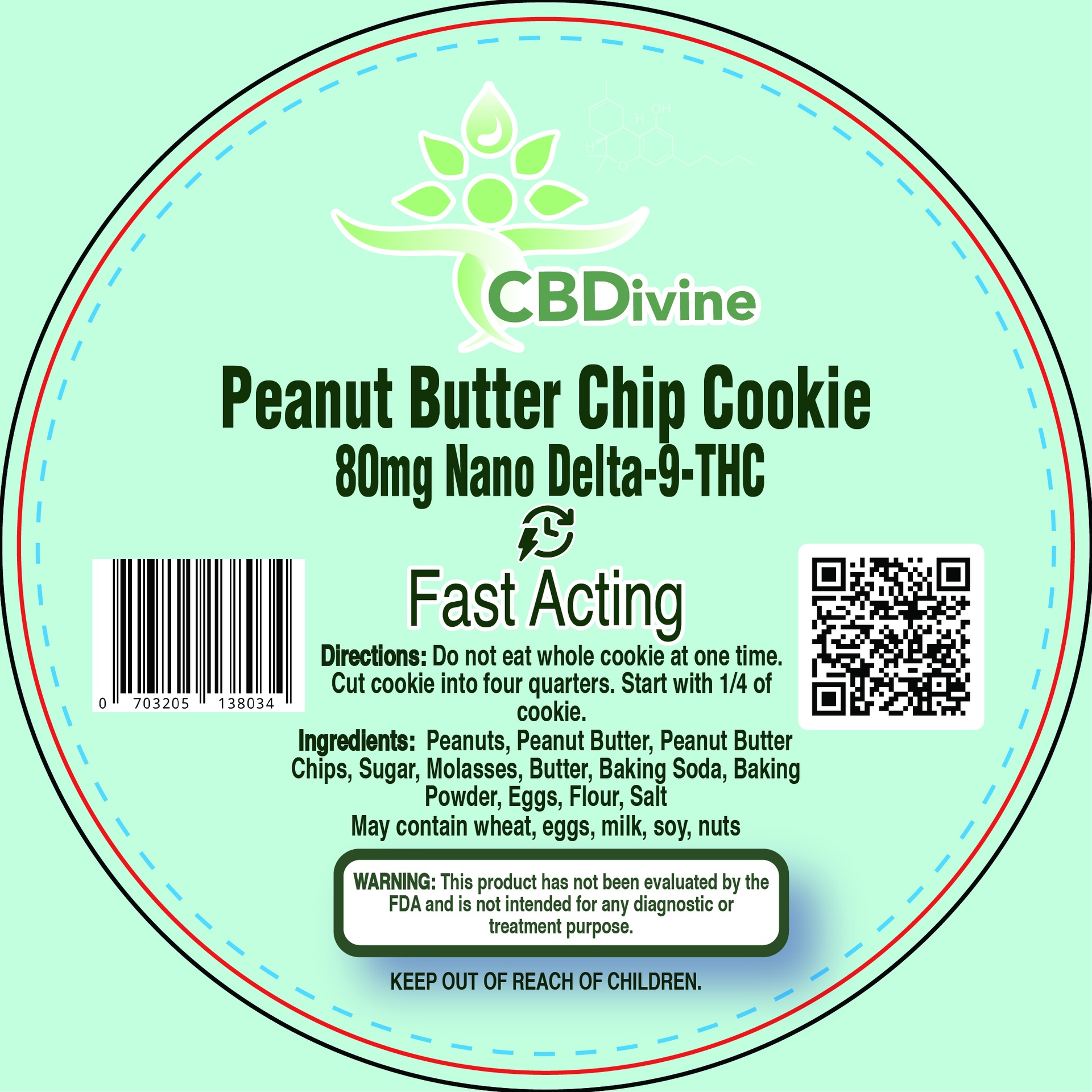 Our CBDivine Peanut Butter Chip Cookie is crafted from the finest ingredients, including:Natural peanut butter, High-quality peanut butter chips, Organic flour, Cane sugar, Butter, Eggs, Baking soda, Vanilla extract, Nano-emulsified hemp-derived Delta 9 THC extract.